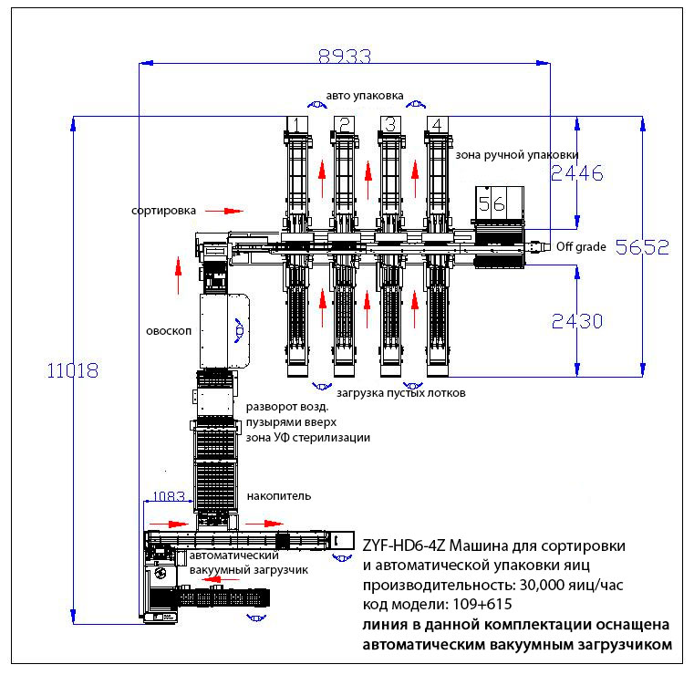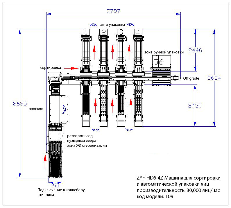 Полностью автоматизированная линия производительностью до 30 000 яиц в час. Электронная система сортировки.