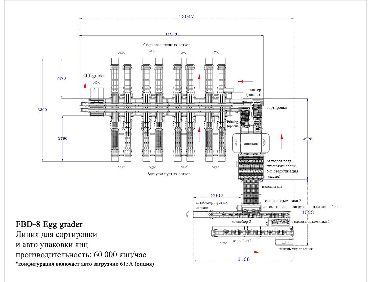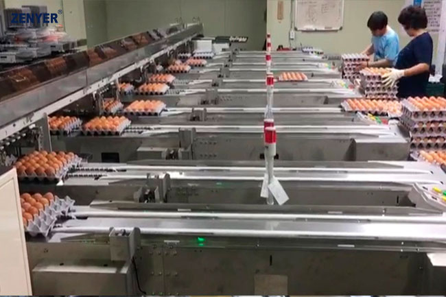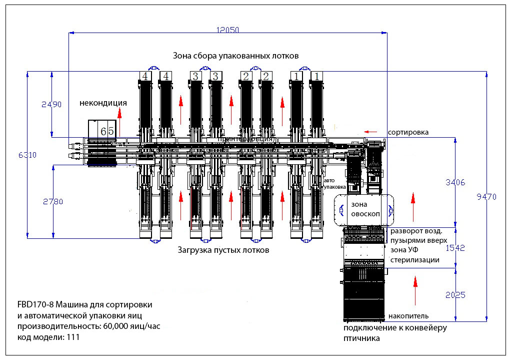 Машина для сортировки и автоматической упаковки яиц ZENYER FBD170 (код модели: 111) имеет производительность до 60 000 яиц в час, включает функции накопления яиц, поворота воздушным пузырем вверх для увеличения срока хранения яиц, зоны овоскопирования, оборудованной зеркалами, зона УФ стерилизации, сортировки автоматической упаковки в лотки различного размера. Встроенный счетчик яиц: по категориям по каждой линии, общий вес и кол-во.